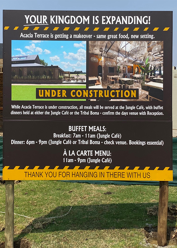 Our restaurant is currently being refurbished, evolving from The Acacia Terrace Restaurant into the brand-new Acacia Table. While it’s still under construction, the redesigned space promises a luxurious, modern and welcoming atmosphere perfect for enjoying meals after a day exploring the Pilanesberg wildlife or the nearby Sun City attractions. Families and couples alike can look forward to a refreshed dining experience that complements the resort’s activities and amenities